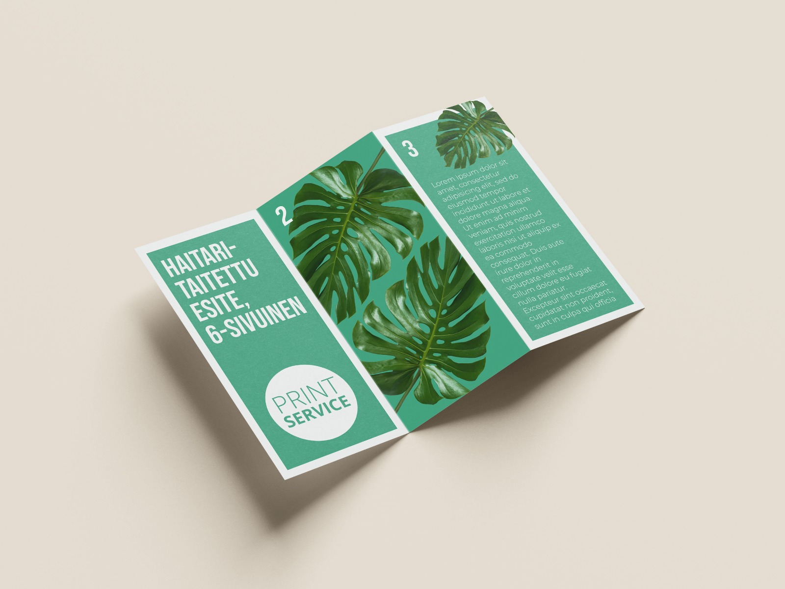 Kun tarvitset enemmän järkevästi jäsenneltyä pinta-alaa kertoa tarinasi. Taitettu esite tarttuu hyvin mukaan, eikä vie kompaktin muotoilunsa ansiosta ylimääräistä säilytystilaa. Tälle esitteelle mahtuu laittaa kaikki halutut yksityiskohdat, kuvien ja kaavioiden kera höystettynä.